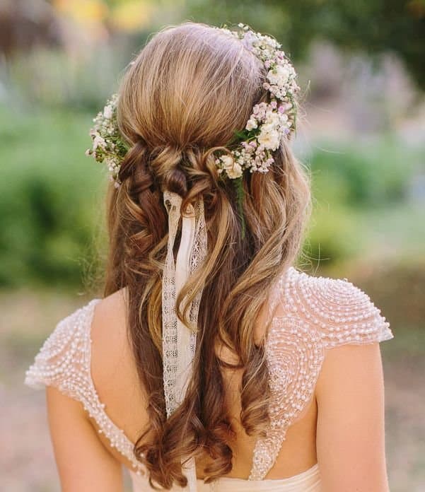 Распущенные волосы тебе не подходят или не вписываются в твое понятие «прически мечты»? Тогда обрати внимание на самые разнообразные стильные и неповторимые сочетания распущенных и немного собранных локонов. Собери волосы со лба или над ушами и заколи – таким образом, ты создашь идеальный вариант собранных локонов, прическу, которая будет удивлять одновременно продуманностью и небрежностью. Классическое платье или кружевной романтичный, легкий наряд – ты сможешь подчеркнуть любой стиль с помощью нескольких шпилек или невидимок. А уж как красиво впишутся в такие прически венки и всяческие цветочные аксессуары! Можно вплести в волосы ленту или небольшую цепочку.